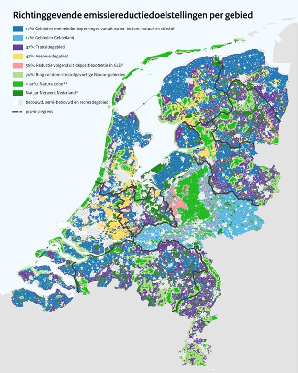 Het terugdringen van NOx door de agrarische-, industriesector en verkeer wordt landelijk geregeld. Voor wat betreft het terugdringen van de stikstofdepositie op de Natura 2000-gebieden, en op het Natuur Netwerk Nederland (NNN, voorheen EHS) is er op de doelstellingenkaart van Nederland aangegeven welk percentage emissiereductie er per gebied gehaald moet worden. Daarbij zijn voor verschillende gebieden verschillende emissiereductiedoelstellingen opgenomen: